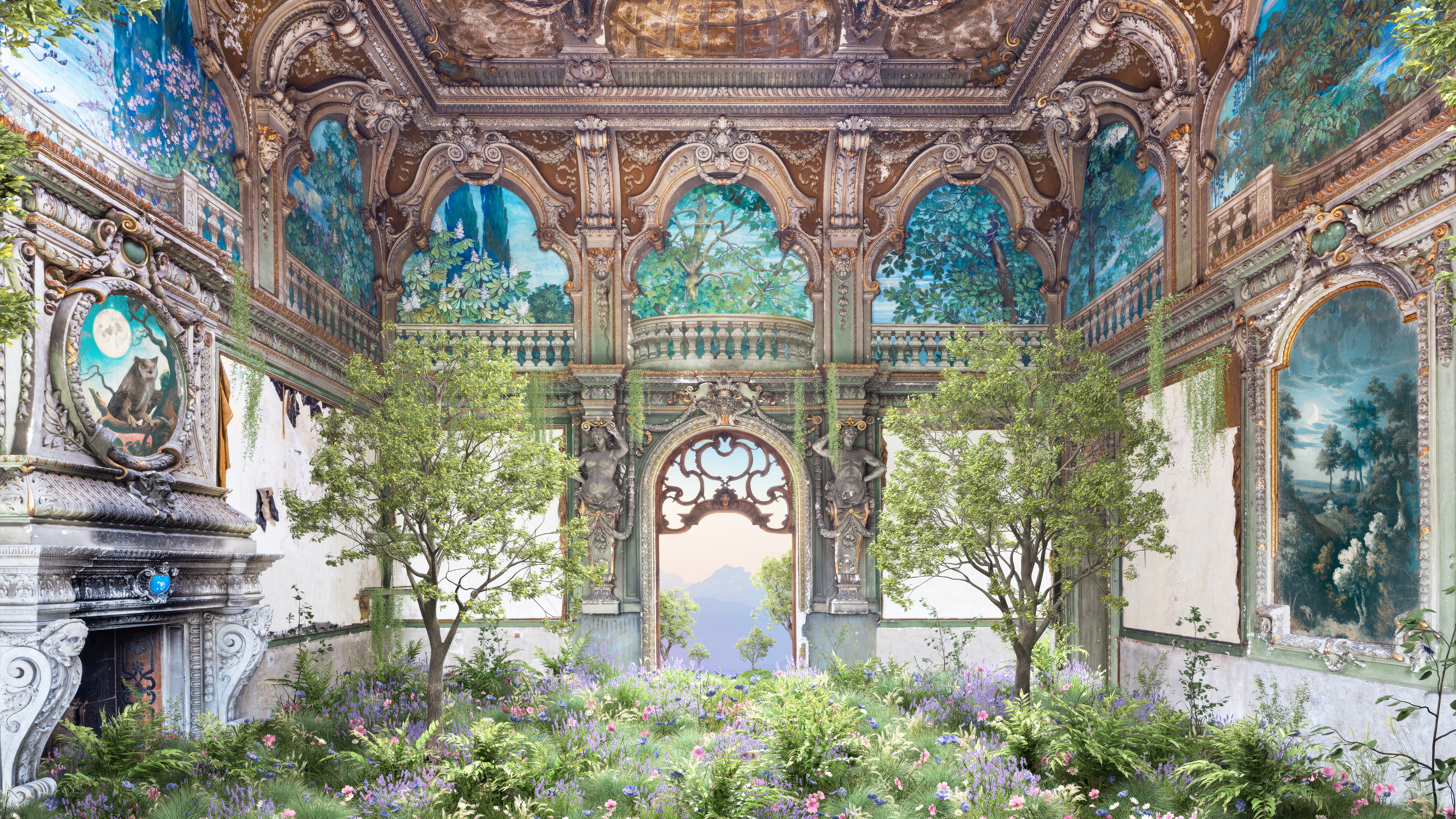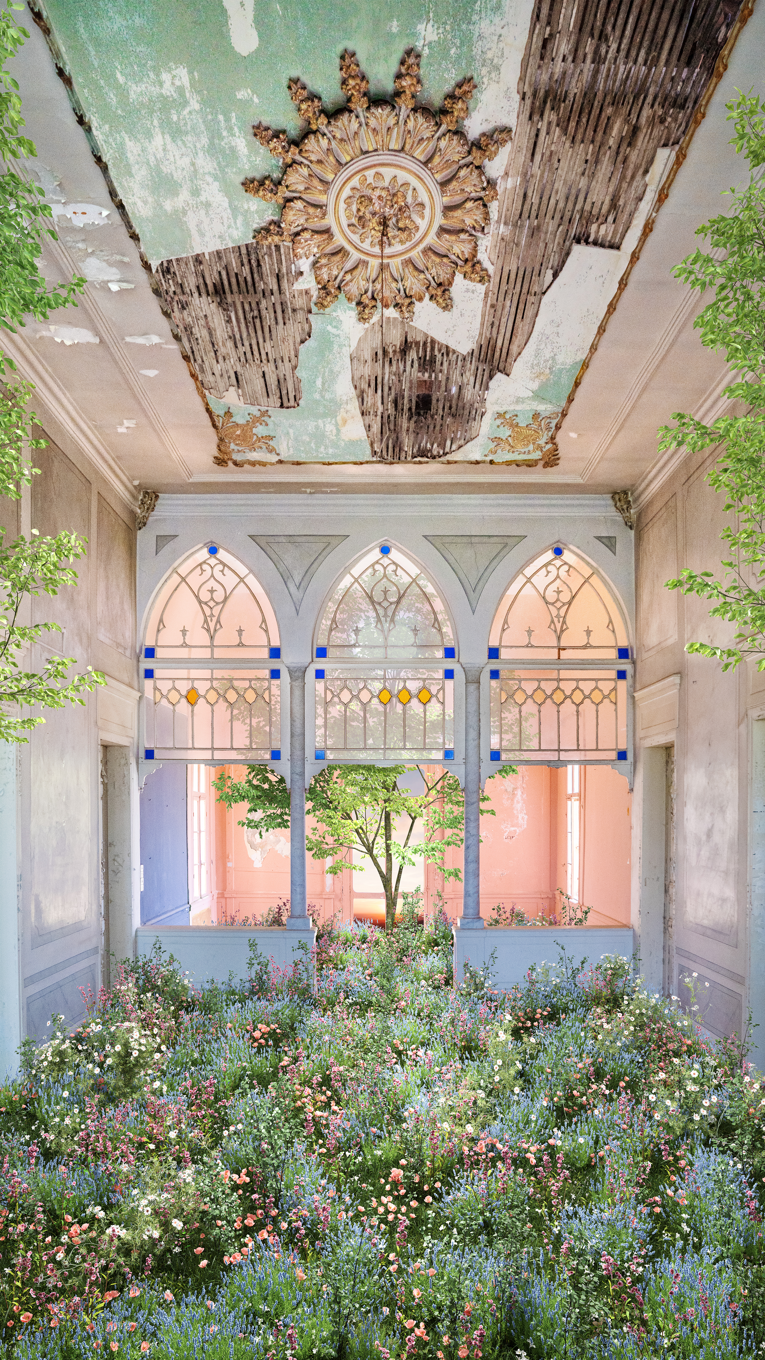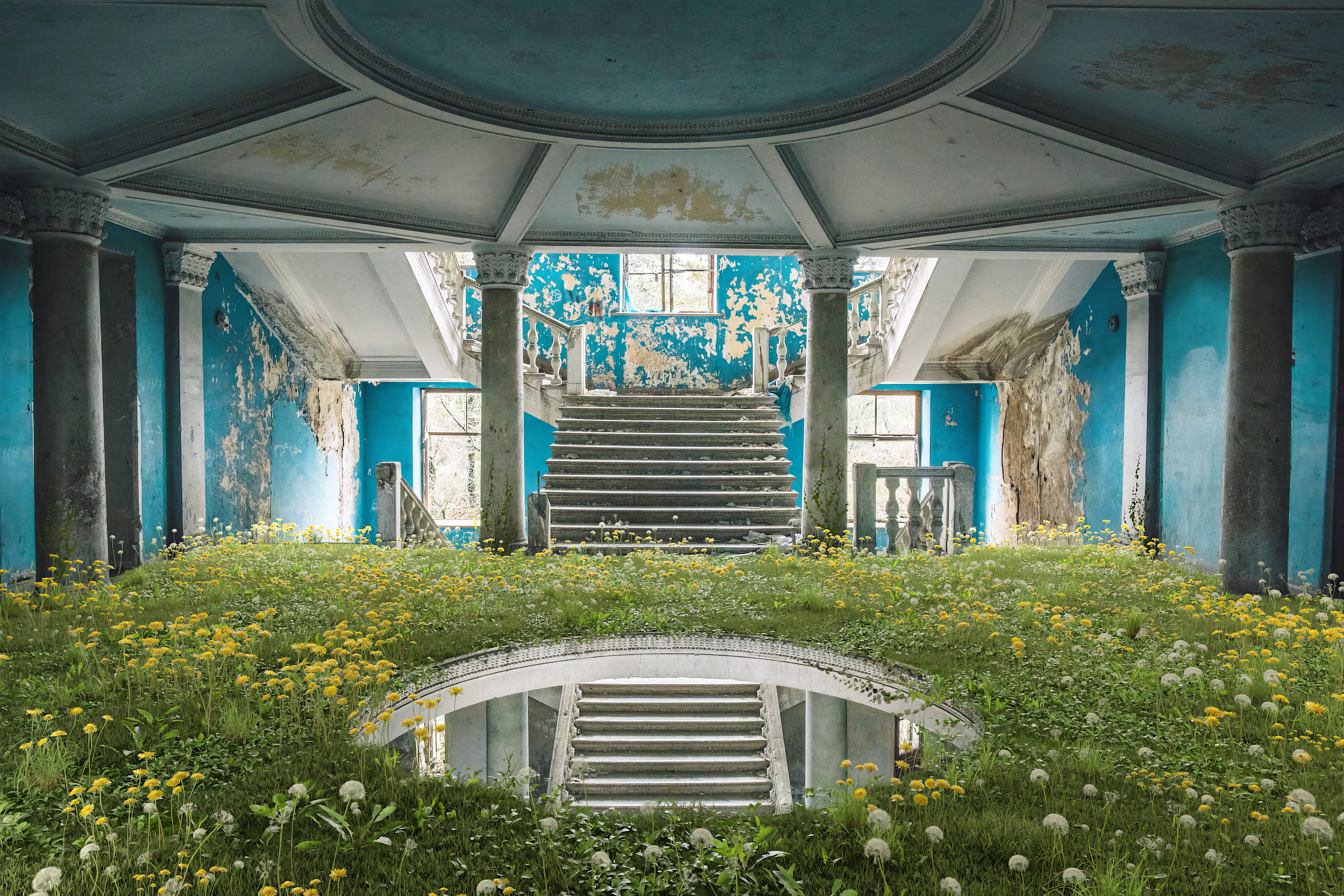 After photography they overlay dense vegetation onto the digitally photographed images, modifying the texture and lighting with the aim of reviving the empty spaces. This as a way to restore the essence of life, in the spaces of abandoned rooms. The results are a surreal collision between the past and the future, the natural and man-made environment, the physical and the digital, the real and the imaginary. The purpose of the artwork is to create a surreal sense of calm and allure during the complicated relationship between the manufactured and natural worlds. In real life many of the buildings depicted in The Wild Within reflect the concept of time passing in the cycle of life's growth and decay.